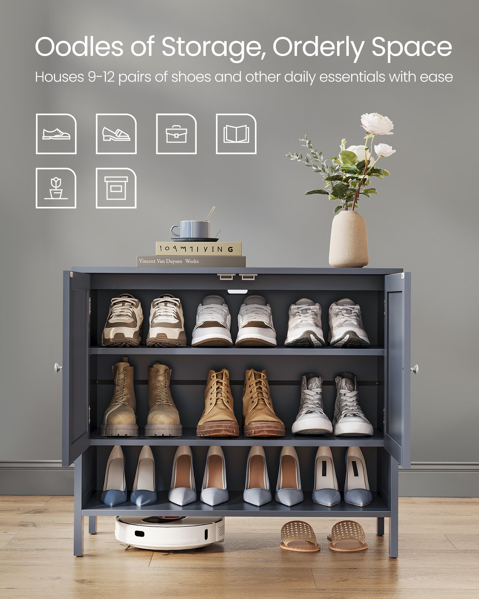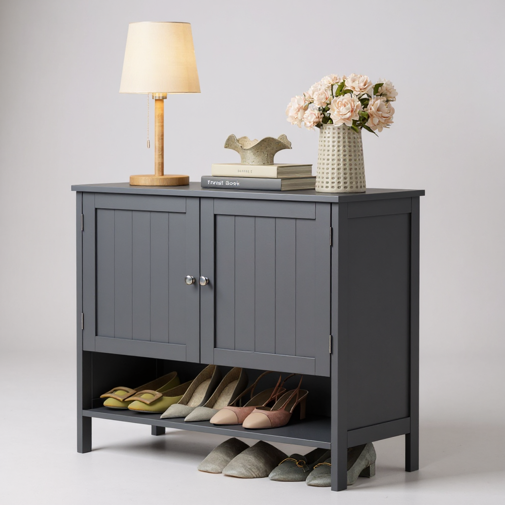 Zatvoreni dio sa vratima omogućava diskretno odlaganje obuće, čuvajući prostor vizuelno čistim i organizovanim, dok donja otvorena polica pruža dodatnu praktičnost za često korištene cipele ili papuče. Njegov klasičan, ali moderan dizajn čini ga idealnim izborom za hodnik, predsoblje ili manji stan gdje je bitna kombinacija stila i funkcionalnosti.