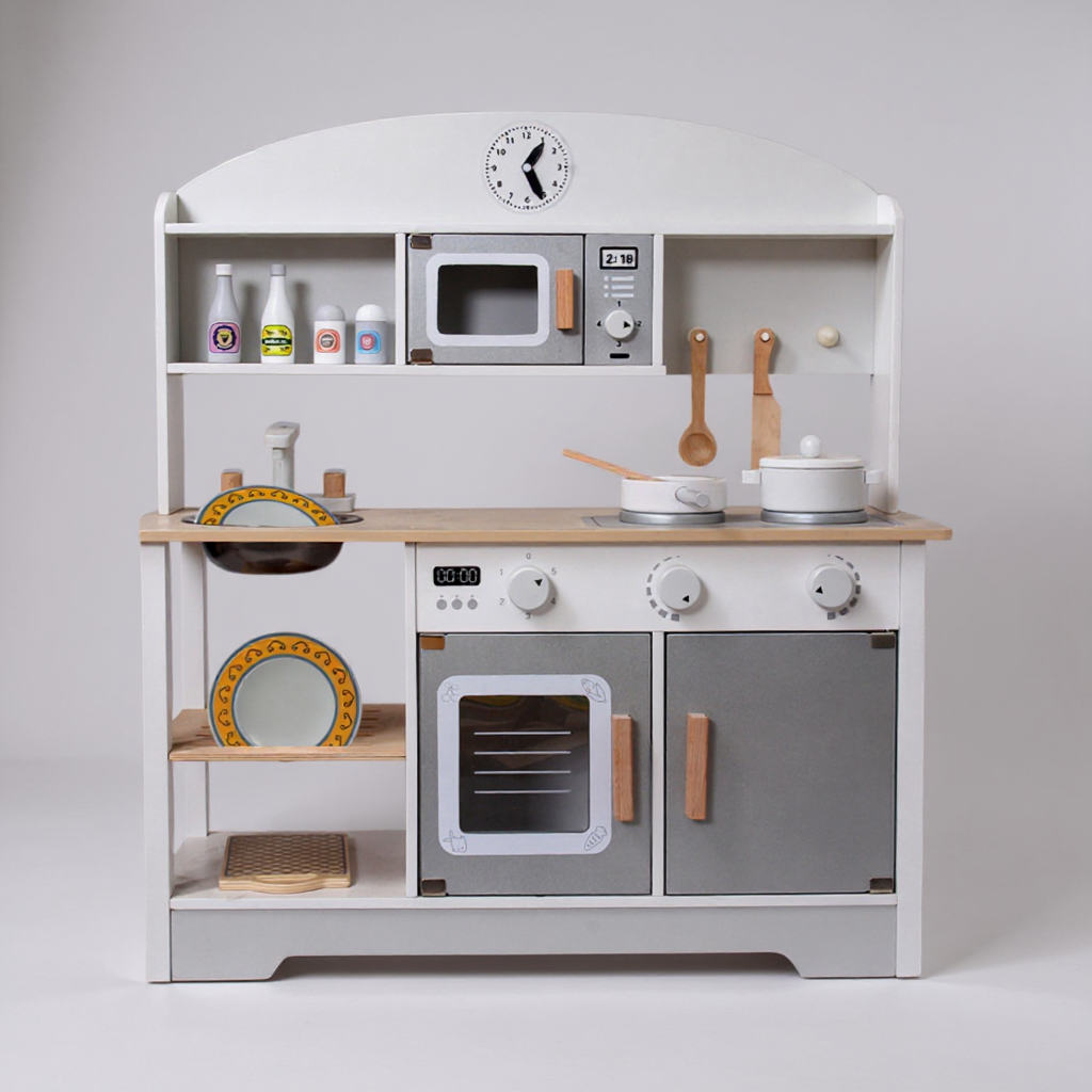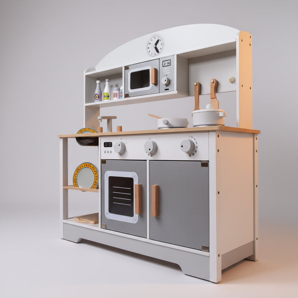 Kuhinica je izrađena od kvalitetnih drvenih materijala, s pažljivo osmišljenim detaljima koji omogućavaju realističnu i dugotrajnu igru. Neutralan i elegantan dizajn lako se uklapa u dječiju sobu ili igraonicu, dok stabilna konstrukcija pruža sigurnost tokom igre.