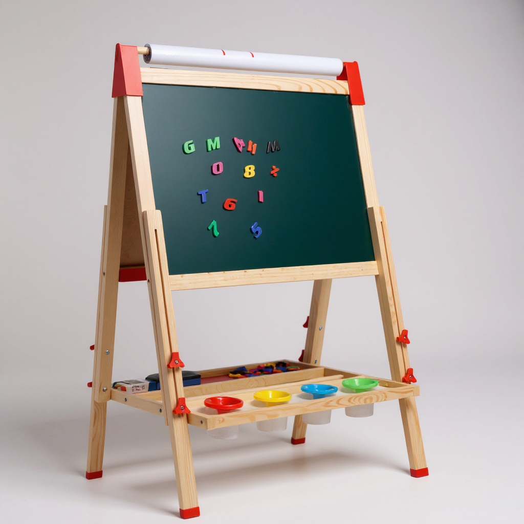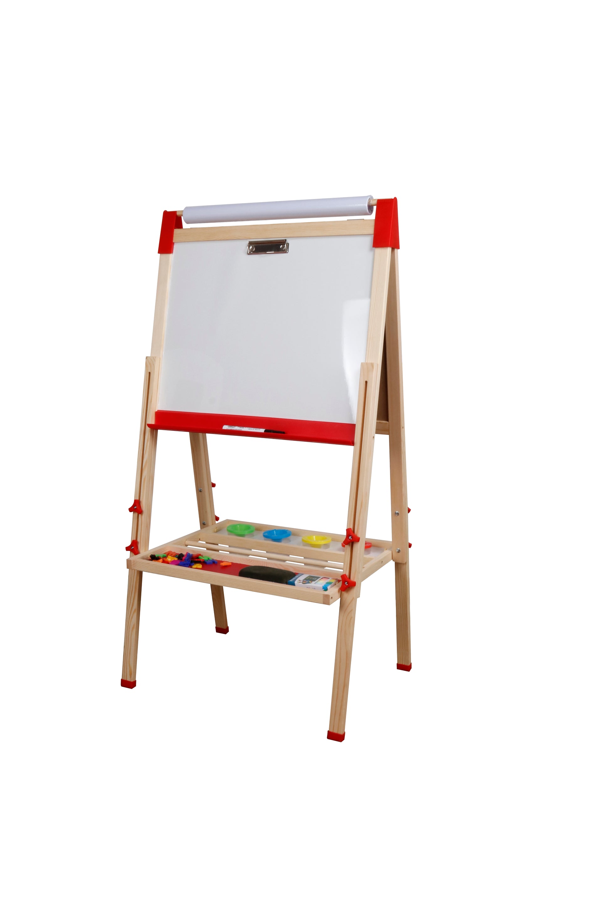 Tabla je izrađena od kvalitetnog borovog drveta, sa podesivom visinom, što omogućava dugotrajnu upotrebu i prilagođavanje djetetu kako raste. U setu dolaze i boje te plastična čaša, čime je sve spremno za kreativnu igru bez dodatne kupovine.