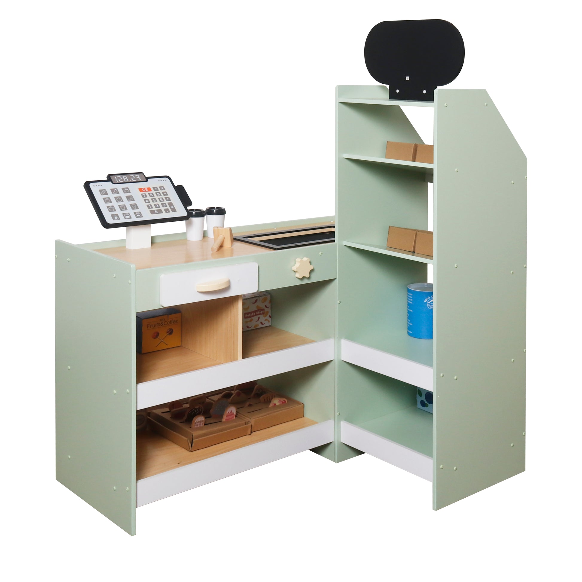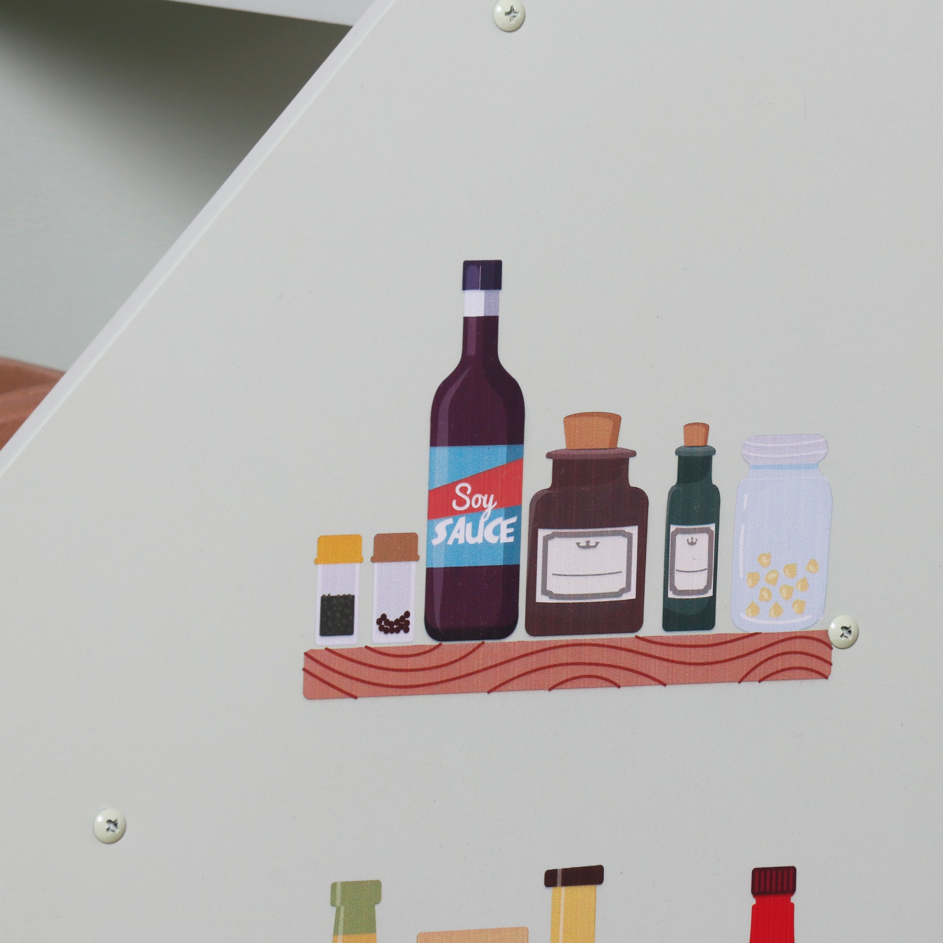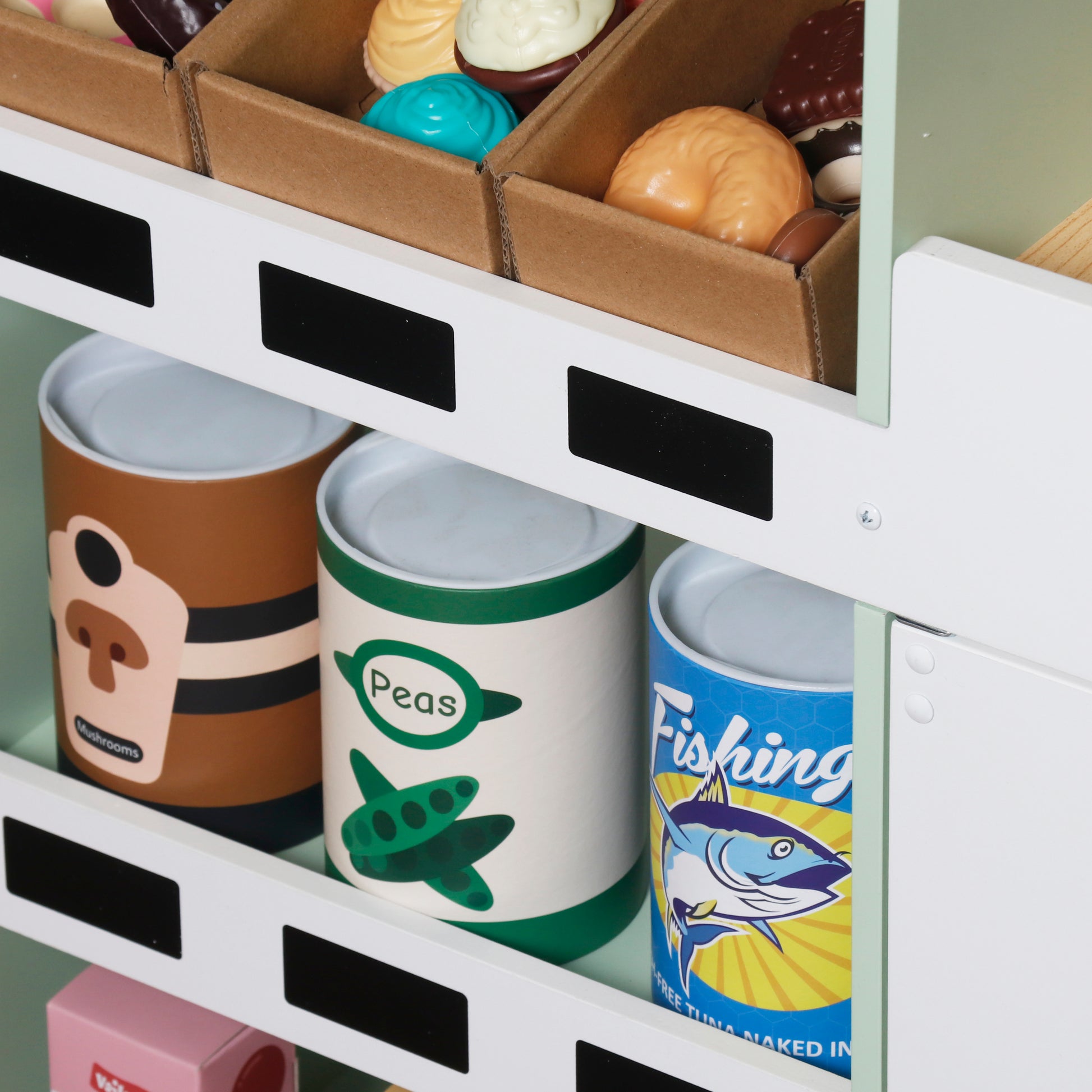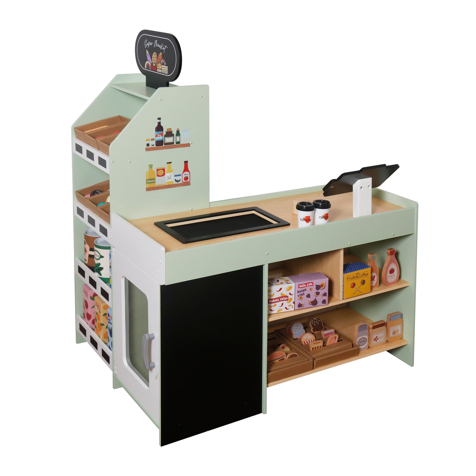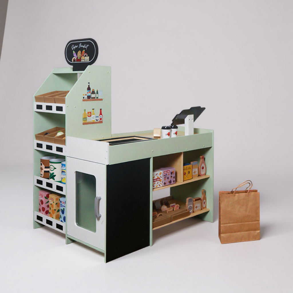 Market je izrađen od kvalitetne kombinacije punog drveta i MDF-a, sa stabilnom konstrukcijom i bogatim detaljima. U setu dolazi 58 dodataka, koji omogućavaju raznovrsnu igru, slaganje proizvoda, organizaciju polica i stvaranje vlastitog „malog bazara“, čime se dodatno razvijaju motorika i logičko razmišljanje.