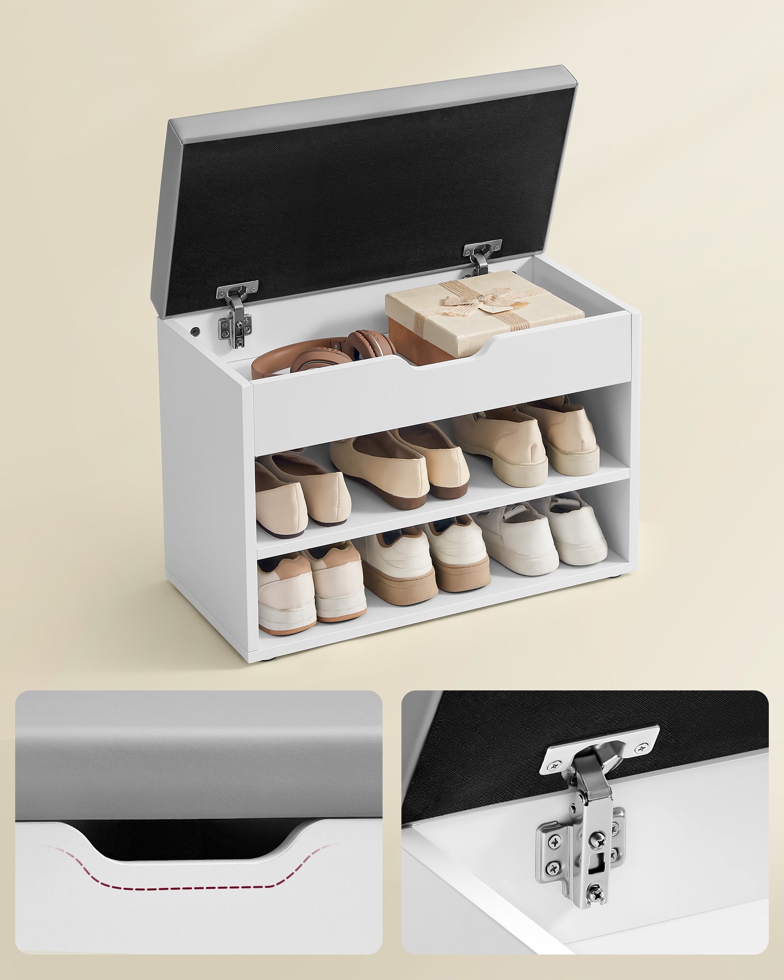 Tapacirano sjedište pruža udobnost prilikom obuvanja i izuvanja, dok otvorene police ispod omogućavaju pregledno i lako odlaganje cipela. Idealna je za hodnike, predsoblje ili manje stanove gdje je važno pametno iskoristiti svaki centimetar prostora. Neutralan dizajn i čiste linije lako se uklapaju u različite stilove enterijera – od modernih do klasičnih.