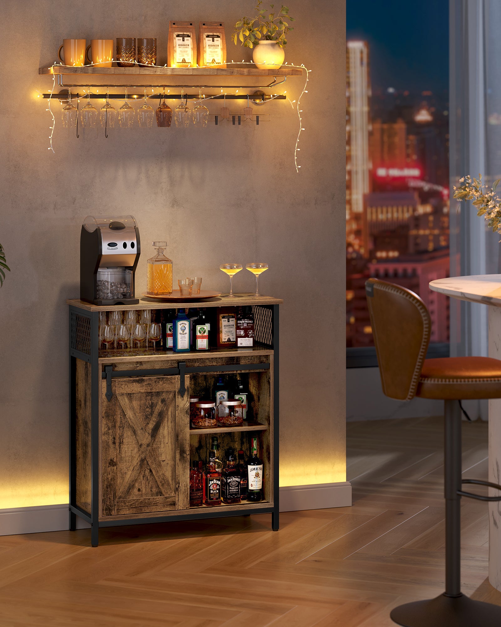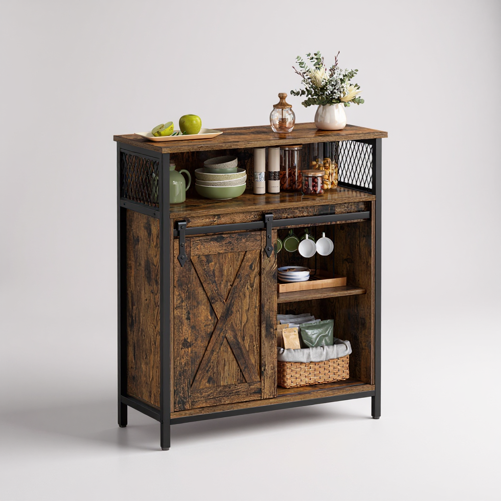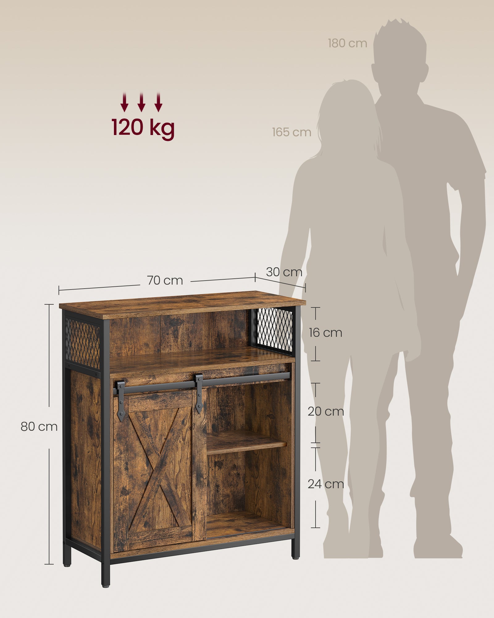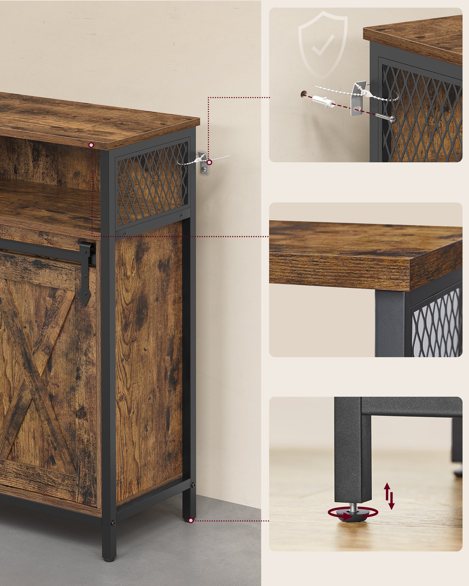 Konstrukcija uključuje gornju otvorenu policu pogodnu za posuđe, dekoracije ili aparate, klizna vrata u barn-style dizajnu koja omogućavaju skrivanje sadržaja po potrebi, te unutrašnje police za organizaciju kuhinjskih potrepština, boca, posuđa ili kućnih dodataka. Sa bočne strane nalaze se metalne mrežaste stranice koje dodatno doprinose stabilnosti i estetici.