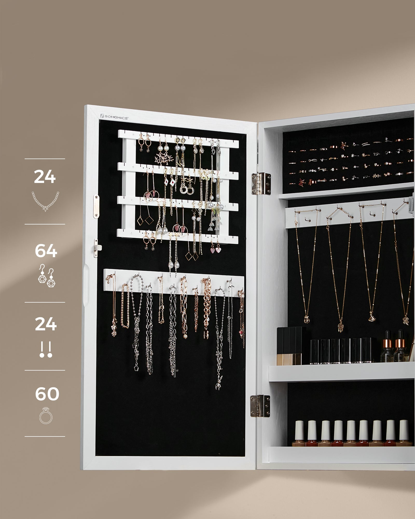 Unutrašnjost obložena mekanom velvet tkaninom štiti vaš nakit od ogrebotina i oštećenja, dok brojni držači, kukice i pregrade omogućavaju pregledno odlaganje ogrlica, narukvica, prstenja i naušnica. Sve je uvijek na svom mjestu, lako dostupno i uredno – bez zapetljanih lančića i izgubljenih pari naušnica.