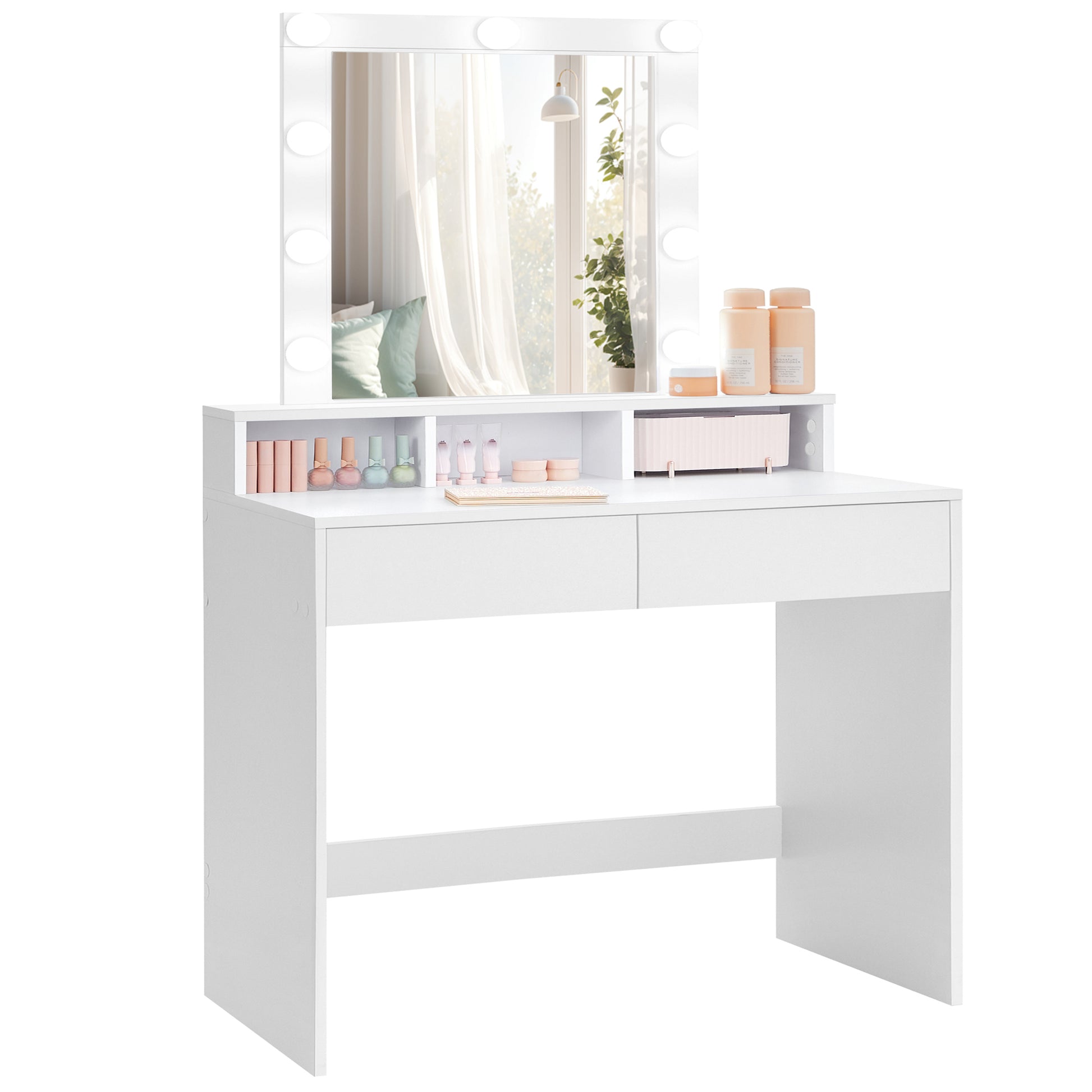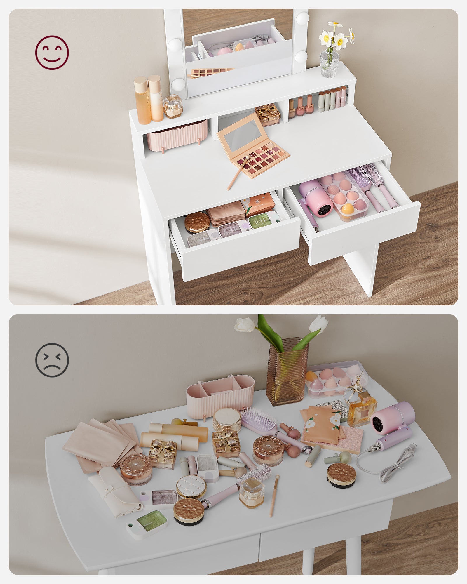 Integrisano ogledalo sa rasvjetom pruža jasno i ravnomjerno svjetlo, idealno za precizno šminkanje i njegu lica u bilo koje doba dana. Praktične police i radna površina omogućavaju da kozmetika, parfemi i dodaci budu uredno organizovani i uvijek pri ruci, bez osjećaja nereda.