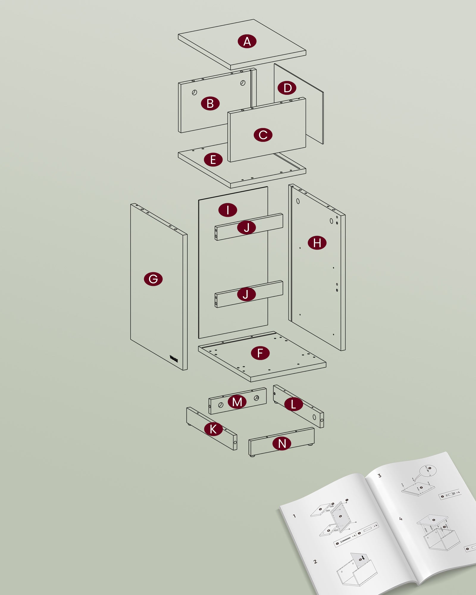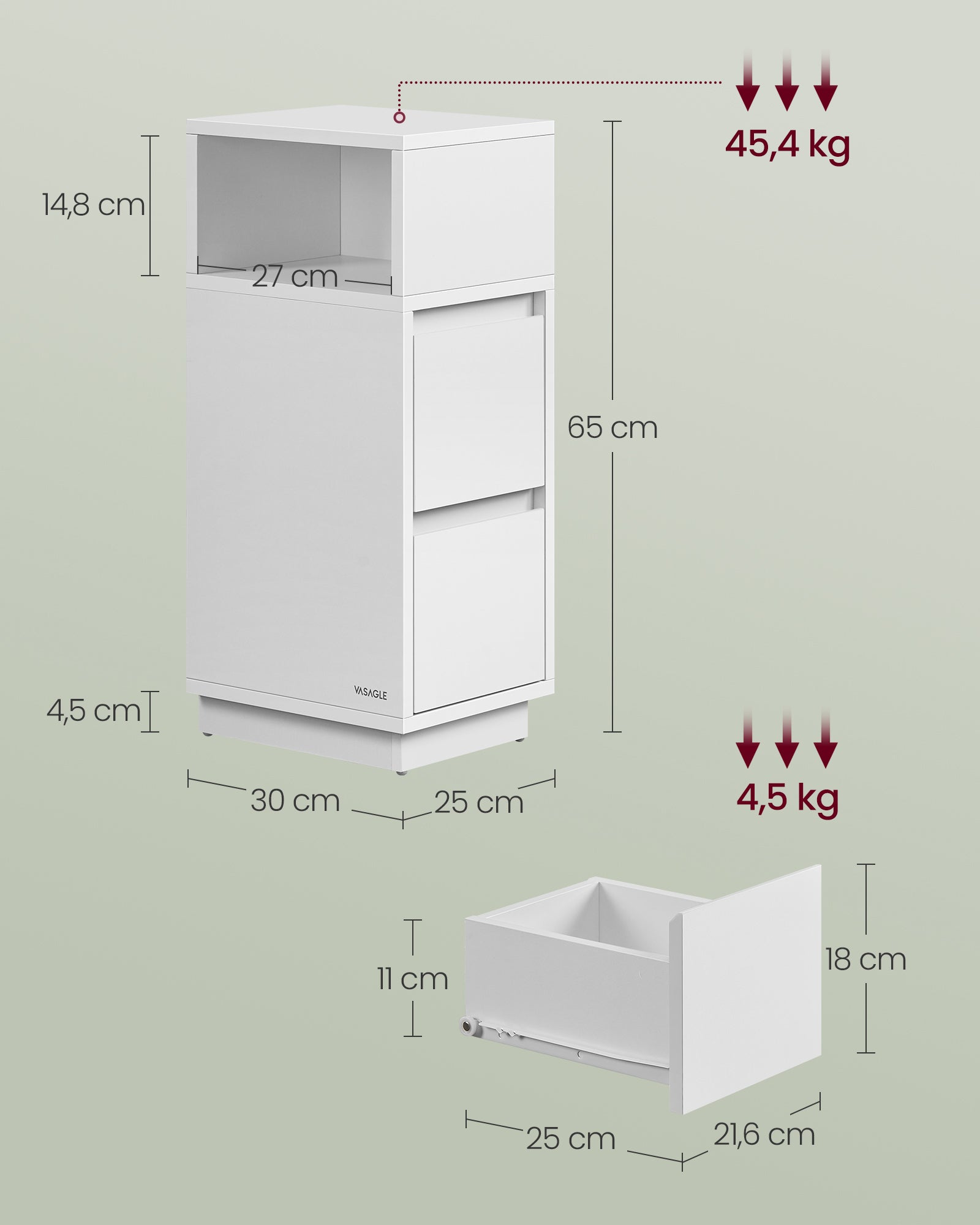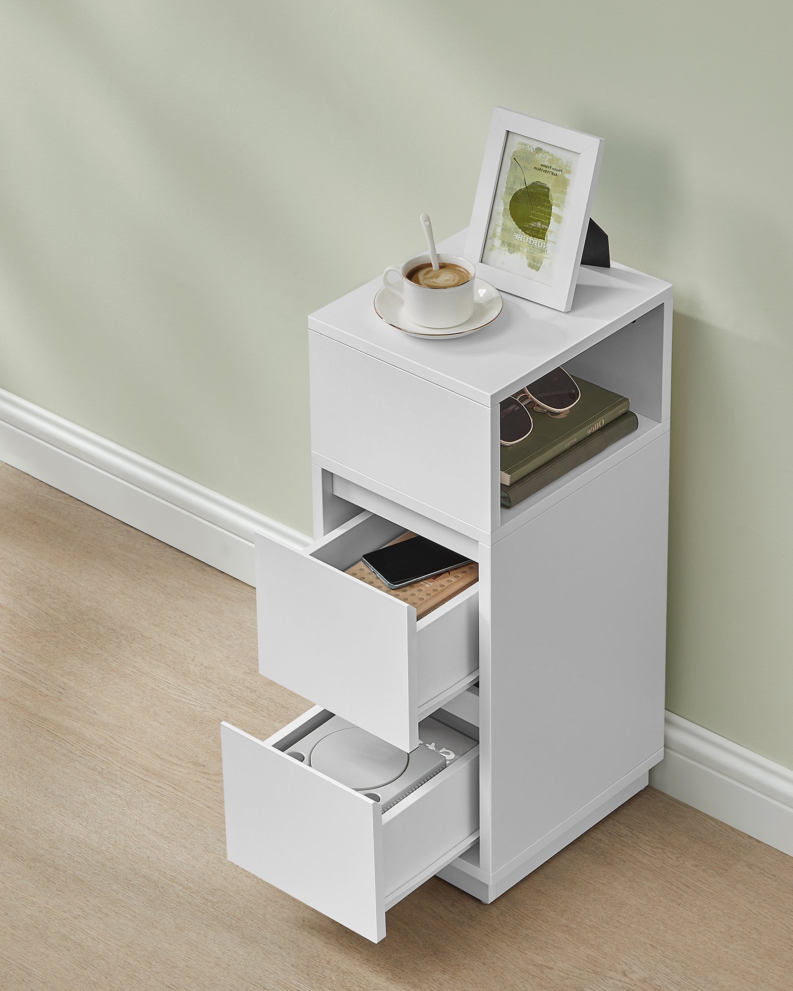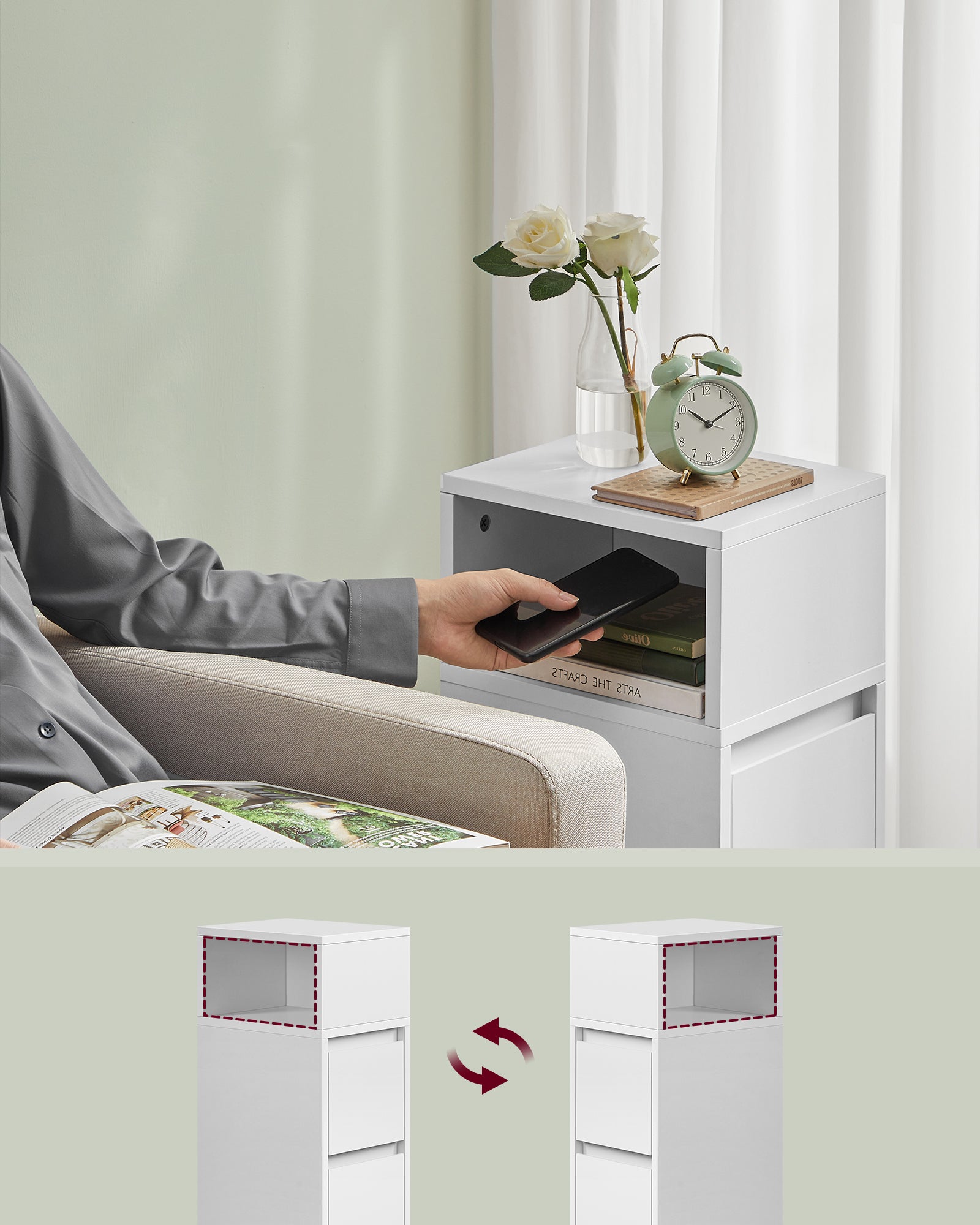 Ormarić je opremljen s dvije praktične ladice koje nude dovoljno prostora za odlaganje knjiga, punjača, ličnih stvari i sitnica koje želite imati nadohvat ruke, ali van pogleda. Otvorena gornja niša dodatno povećava funkcionalnost i idealna je za telefon, tablet ili omiljenu knjigu.