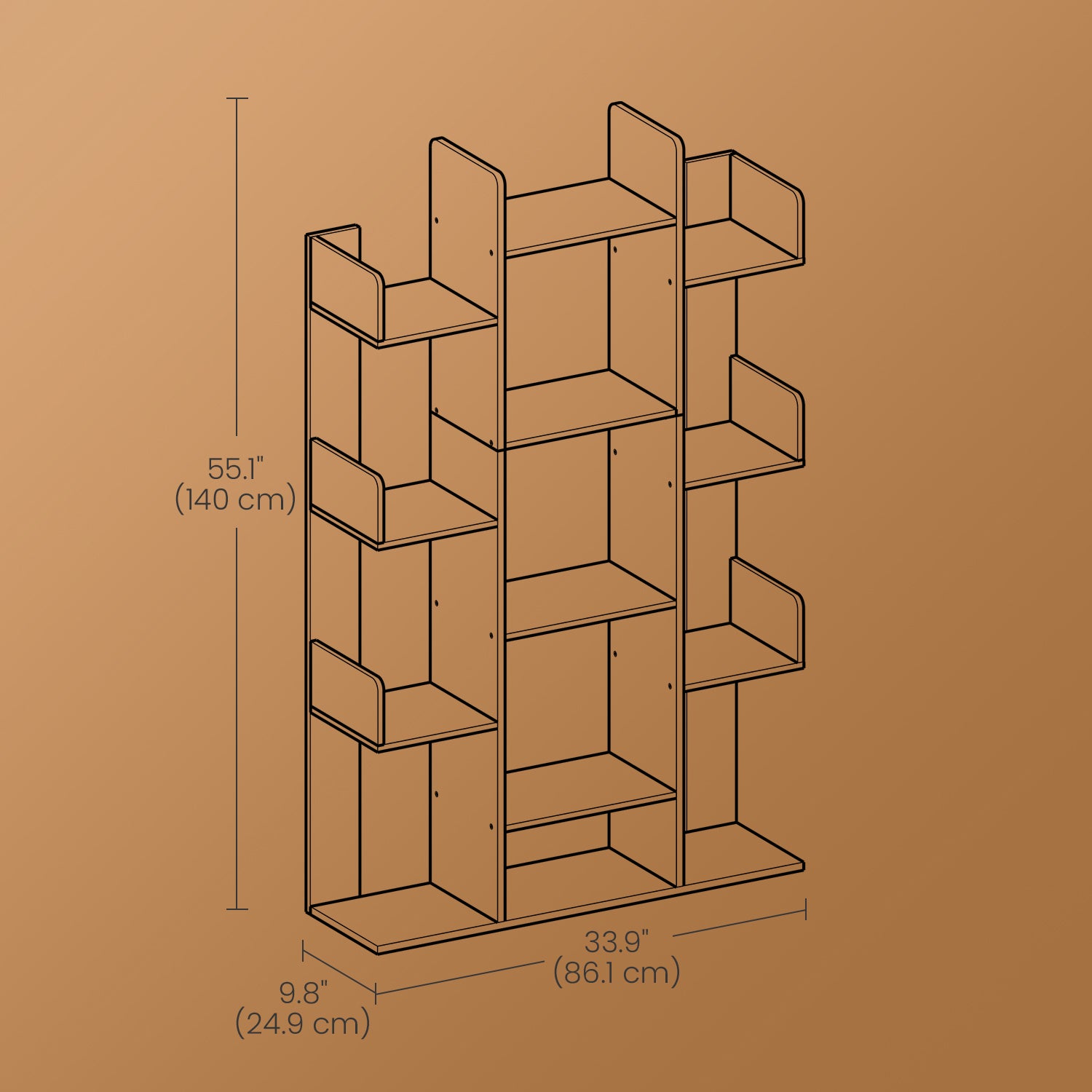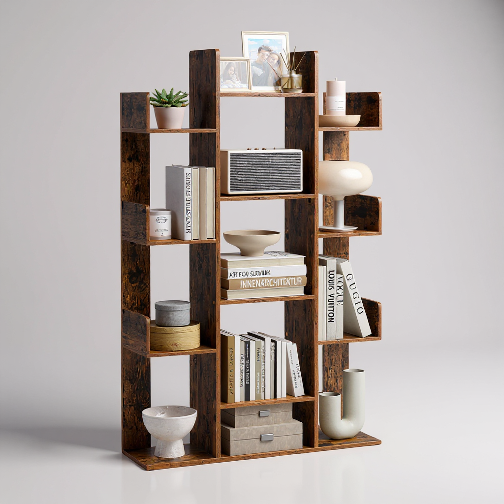 Nest polica je osmišljena kao funkcionalan, ali i izrazito dekorativan element. Njen nepravilni, „stepenasti“ raspored polica unosi dinamiku u prostor i omogućava kreativno slaganje knjiga, dekoracija i ličnih predmeta. Tamni drveni ton dodatno naglašava toplinu i čini je upečatljivim detaljem u dnevnom boravku, spavaćoj sobi ili radnom kutku.