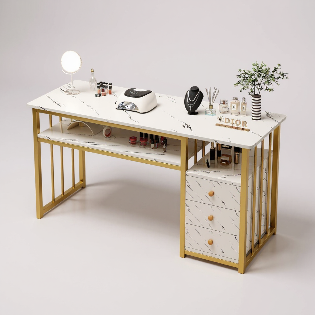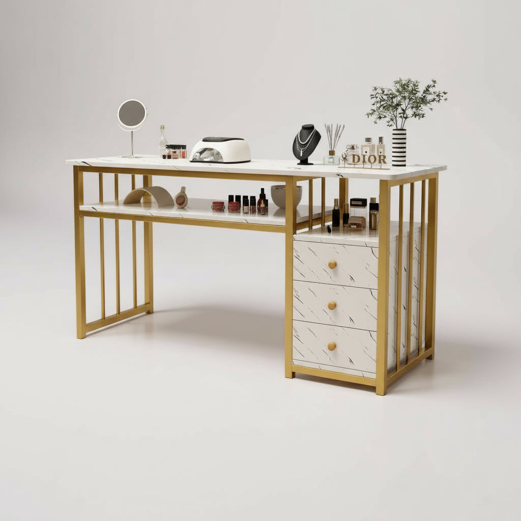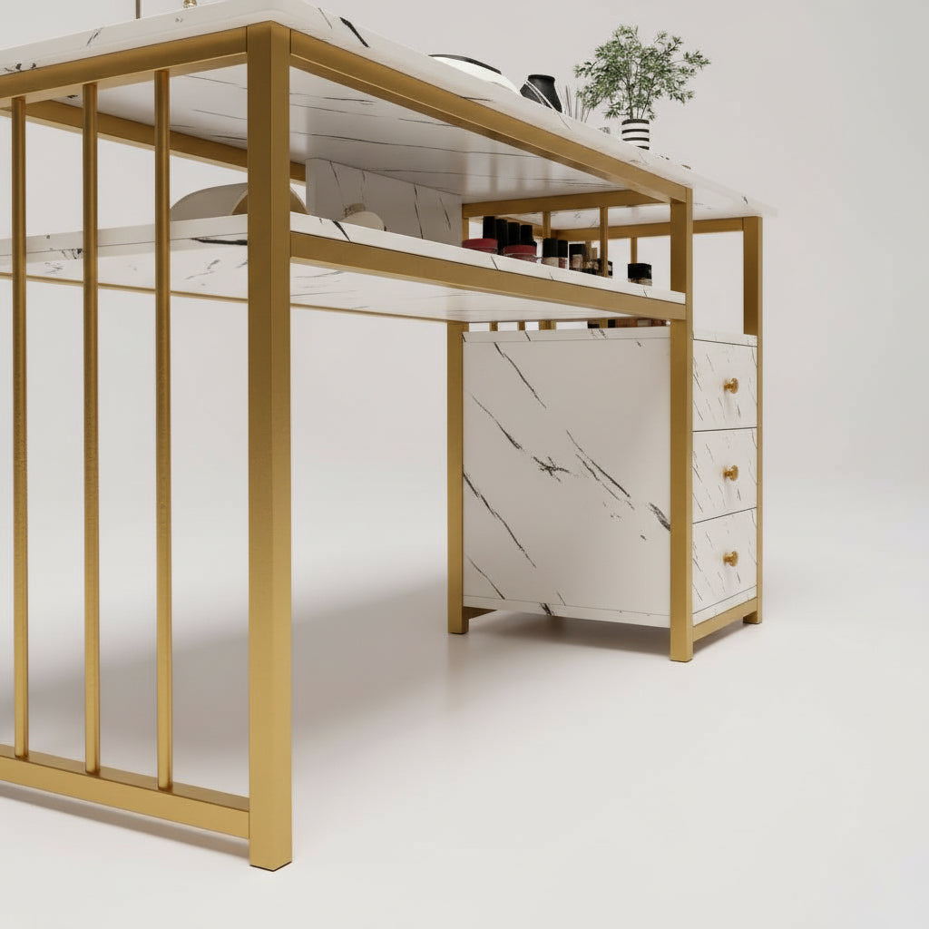 Sto Velia – bijeli predstavlja savršen spoj luksuza i funkcionalnosti, namijenjen modernim i elegantnim radnim ili trpezarijskim prostorima. Kombinacija bijele ploče i zlatne metalne konstrukcije daje prostoru profinjen izgled i naglašava osjećaj urednosti i stila.