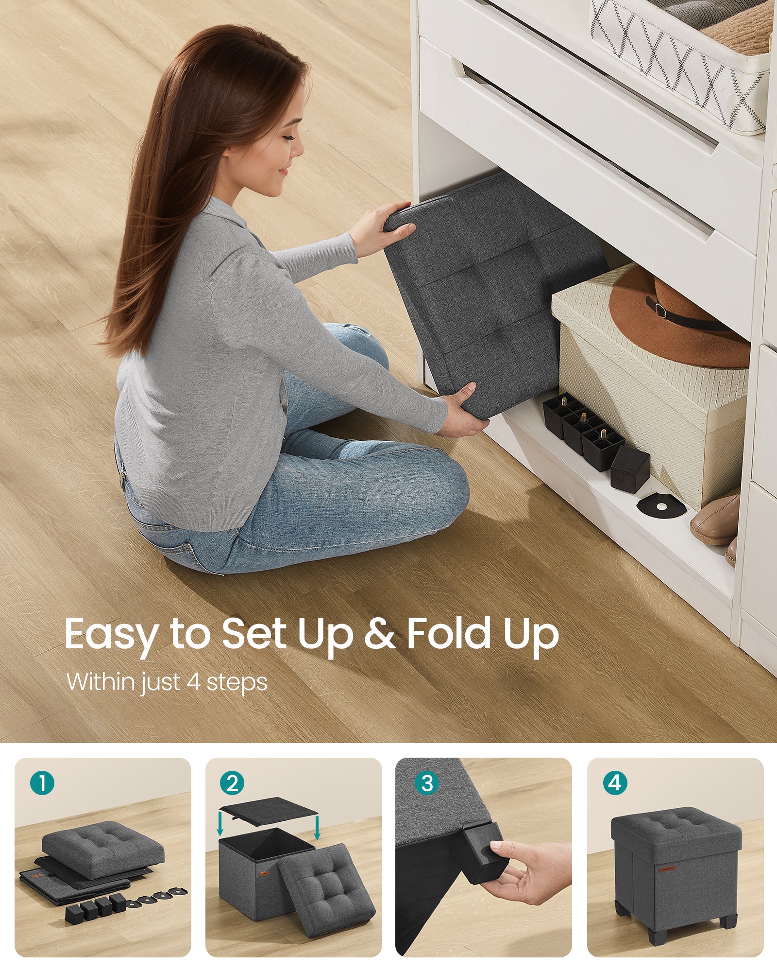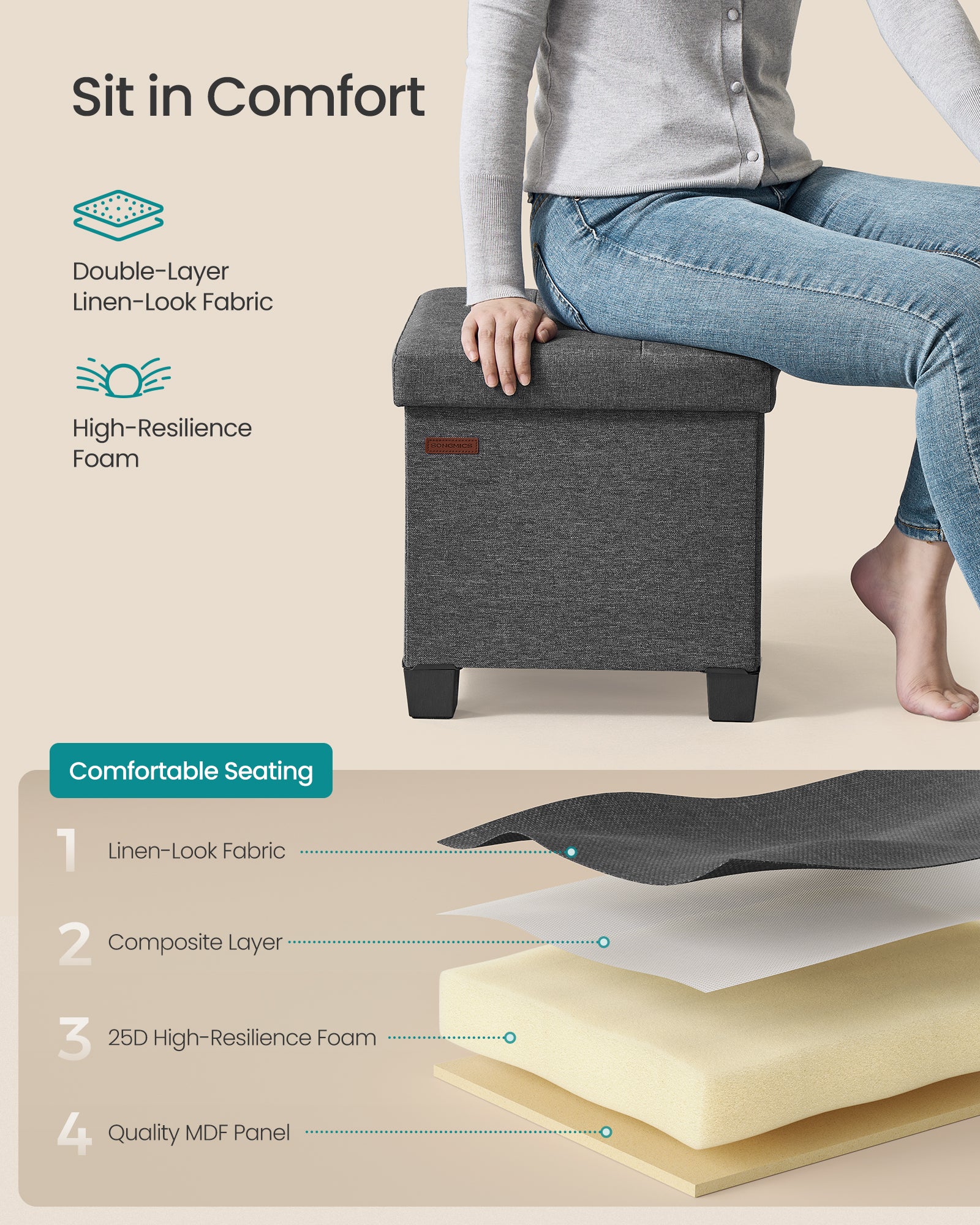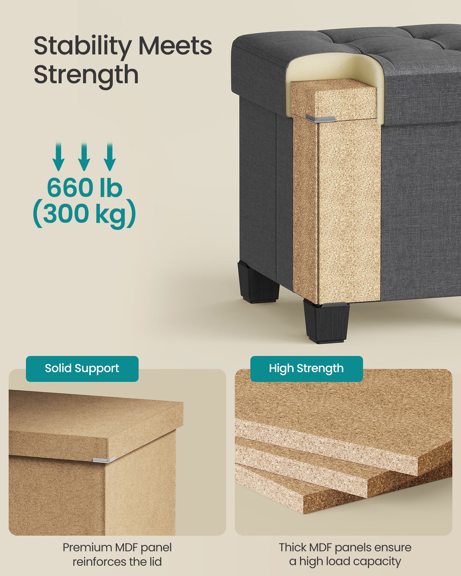 Tapaciran je kvalitetnom tkaninom u neutralnoj sivoj nijansi koja se lako uklapa u različite stilove enterijera. Čvrsta MDF konstrukcija pruža stabilnost i dugotrajnost, dok mekano podstavljeno sjedište osigurava udobno korištenje, bilo kao tabure, oslonac za noge ili pomoćno sjedište. Poklopac se jednostavno skida, otkrivajući praktičnu kutiju za odlaganje deka, igračaka, jastuka ili sitnica koje želite držati van pogleda.